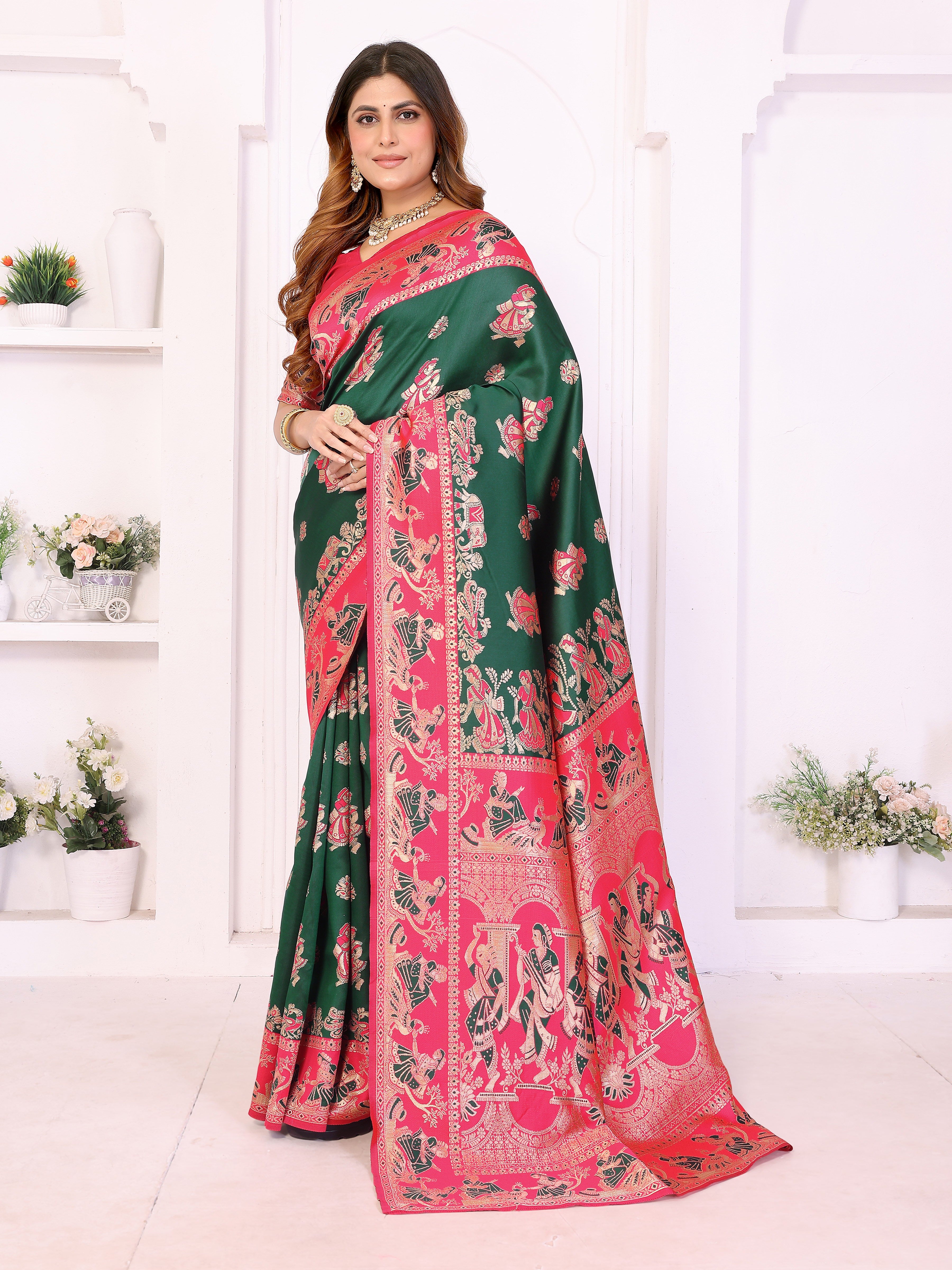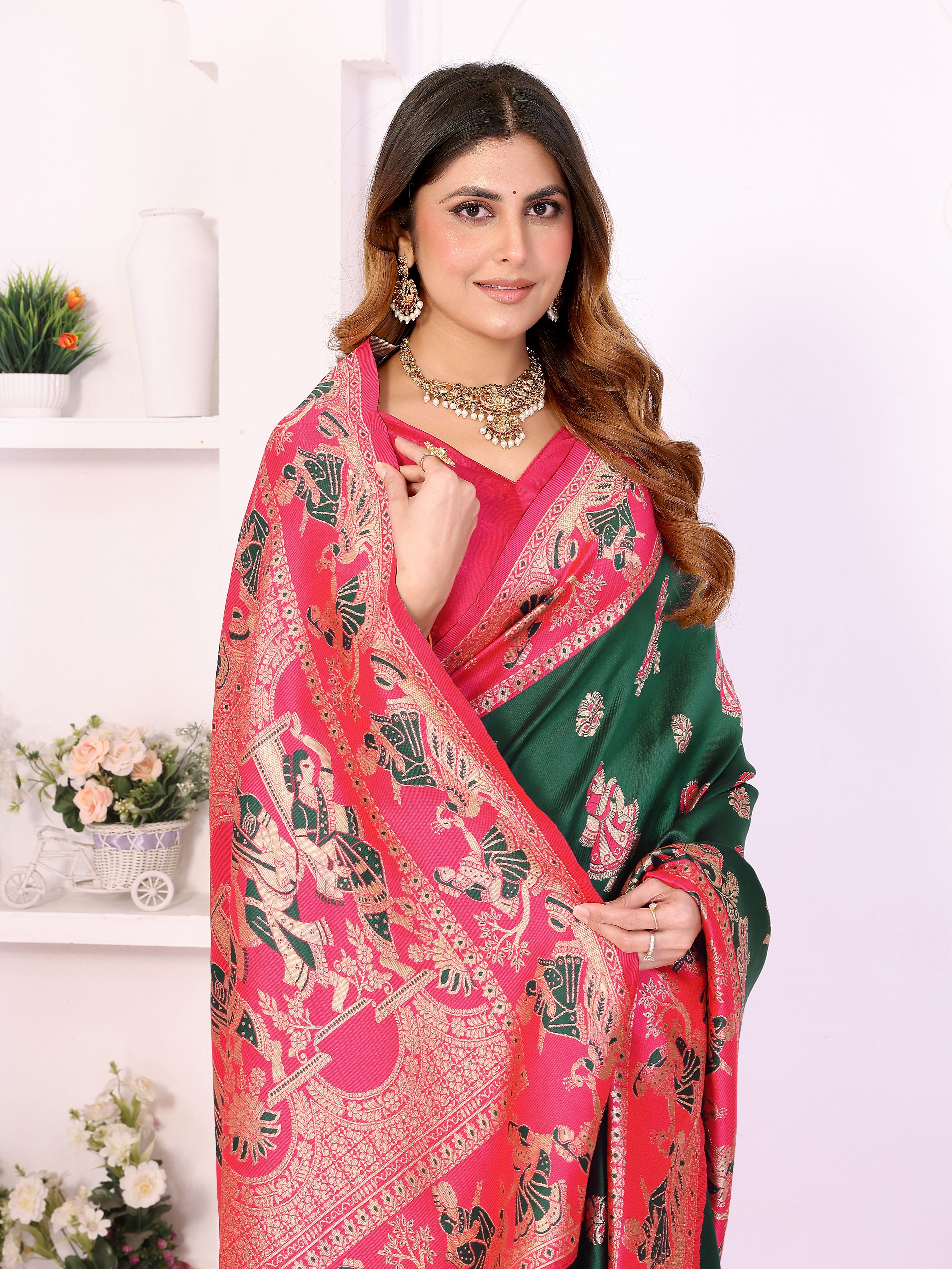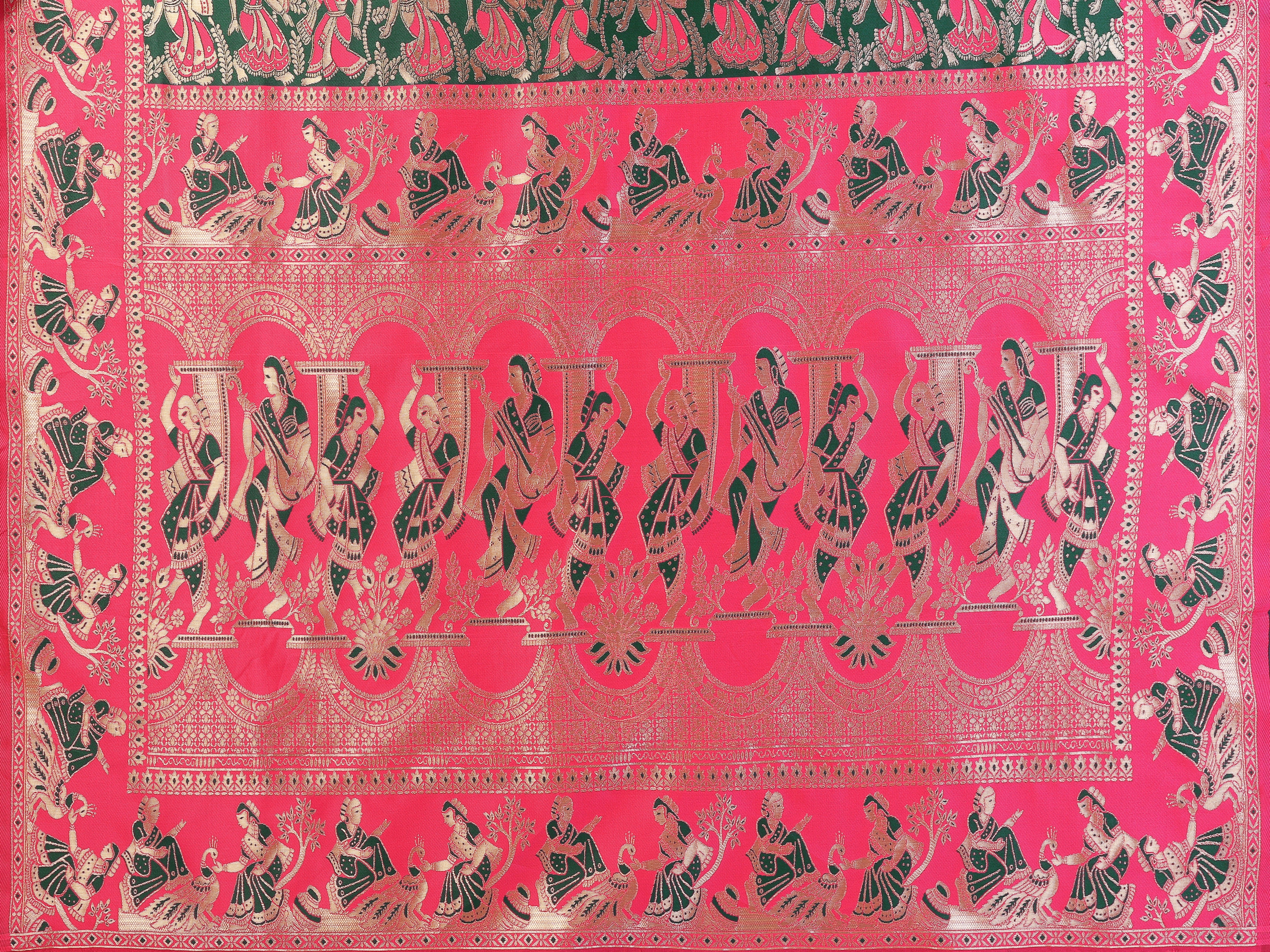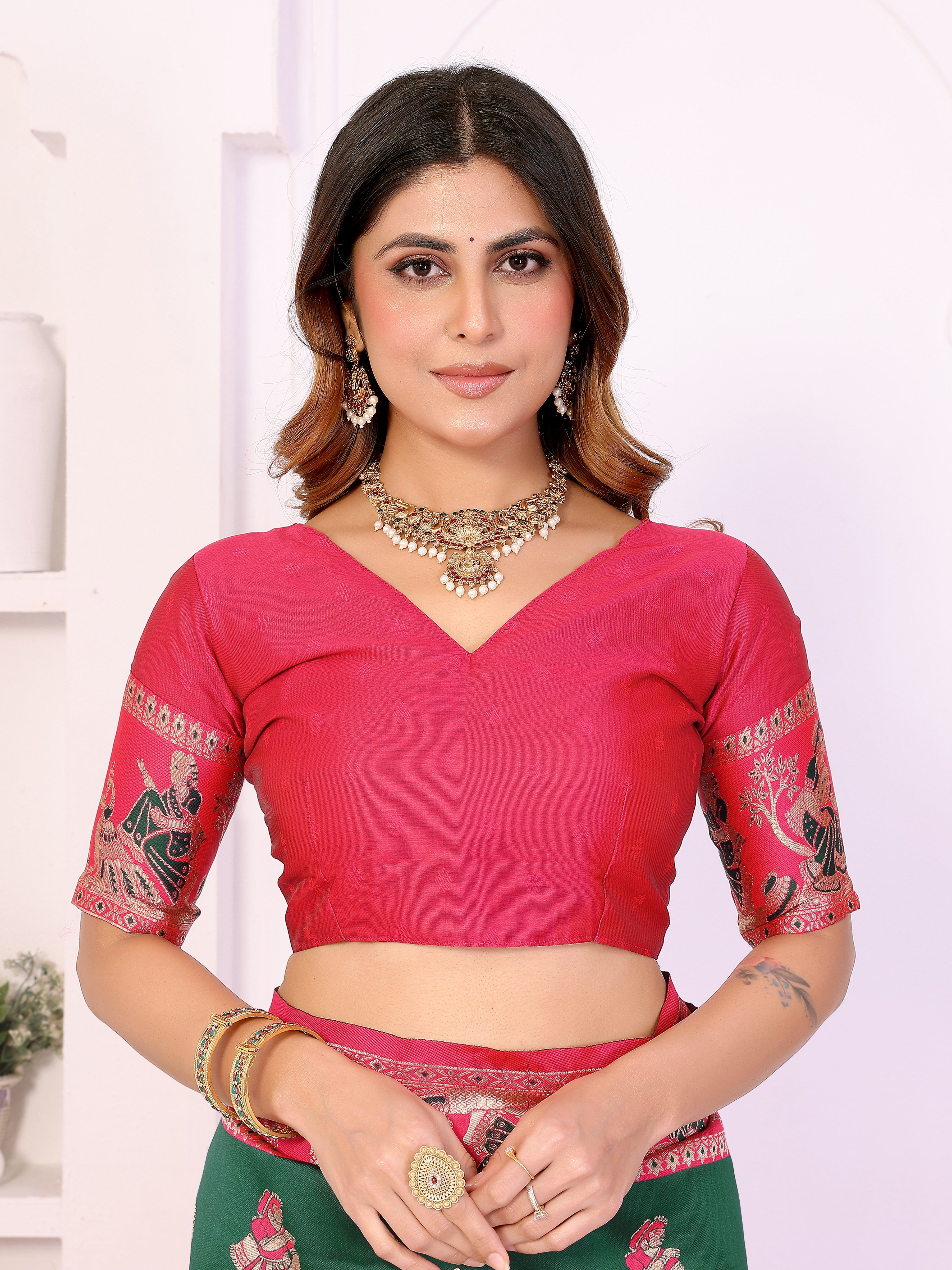 Details: This elegant green and pink saree features rich traditional motifs and a beautifully detailed pallu. Made from soft, smooth fabric, it drapes gracefully and includes a matching blouse piece—perfect for festive occasions, weddings, and cultural celebrations.