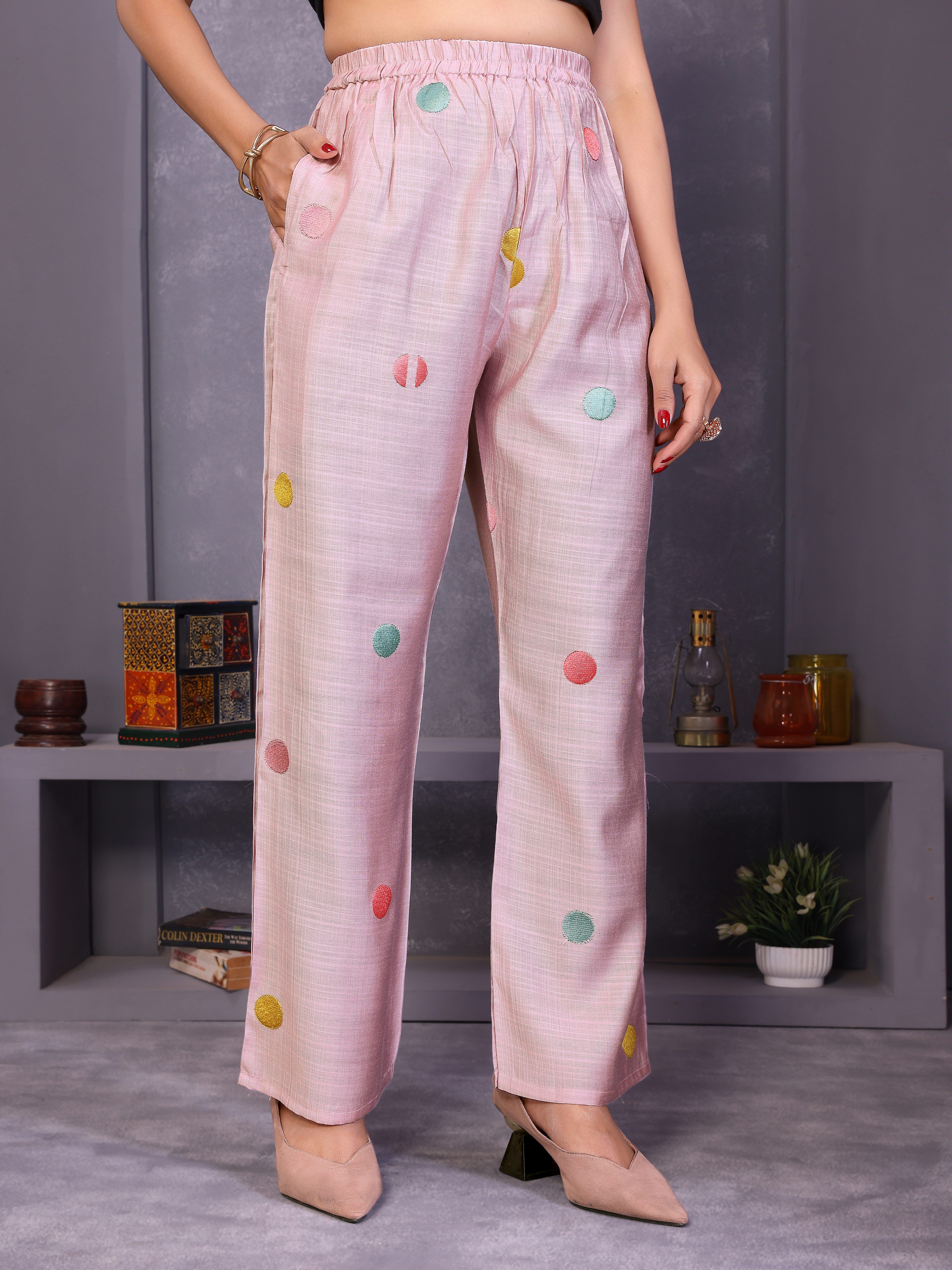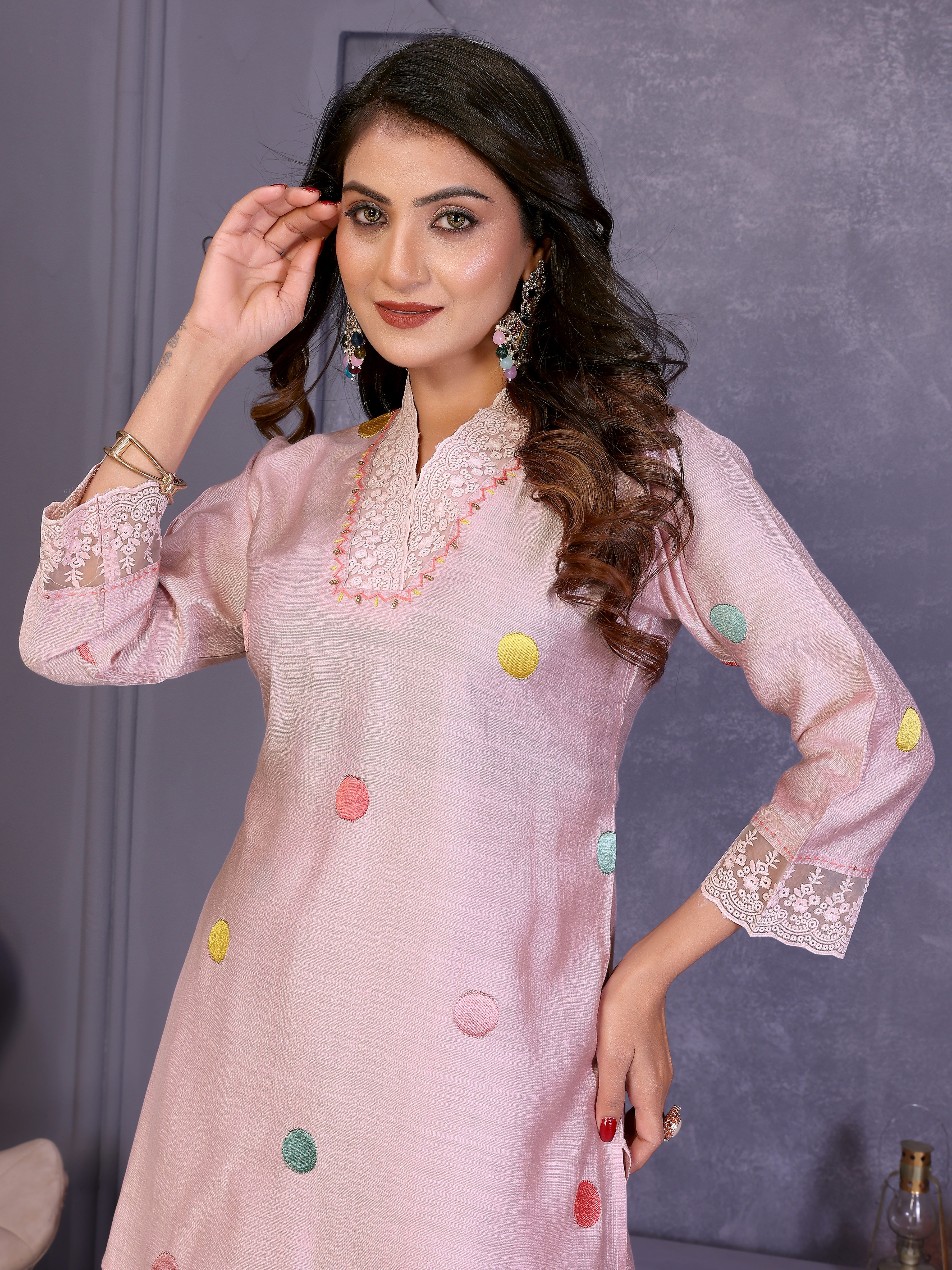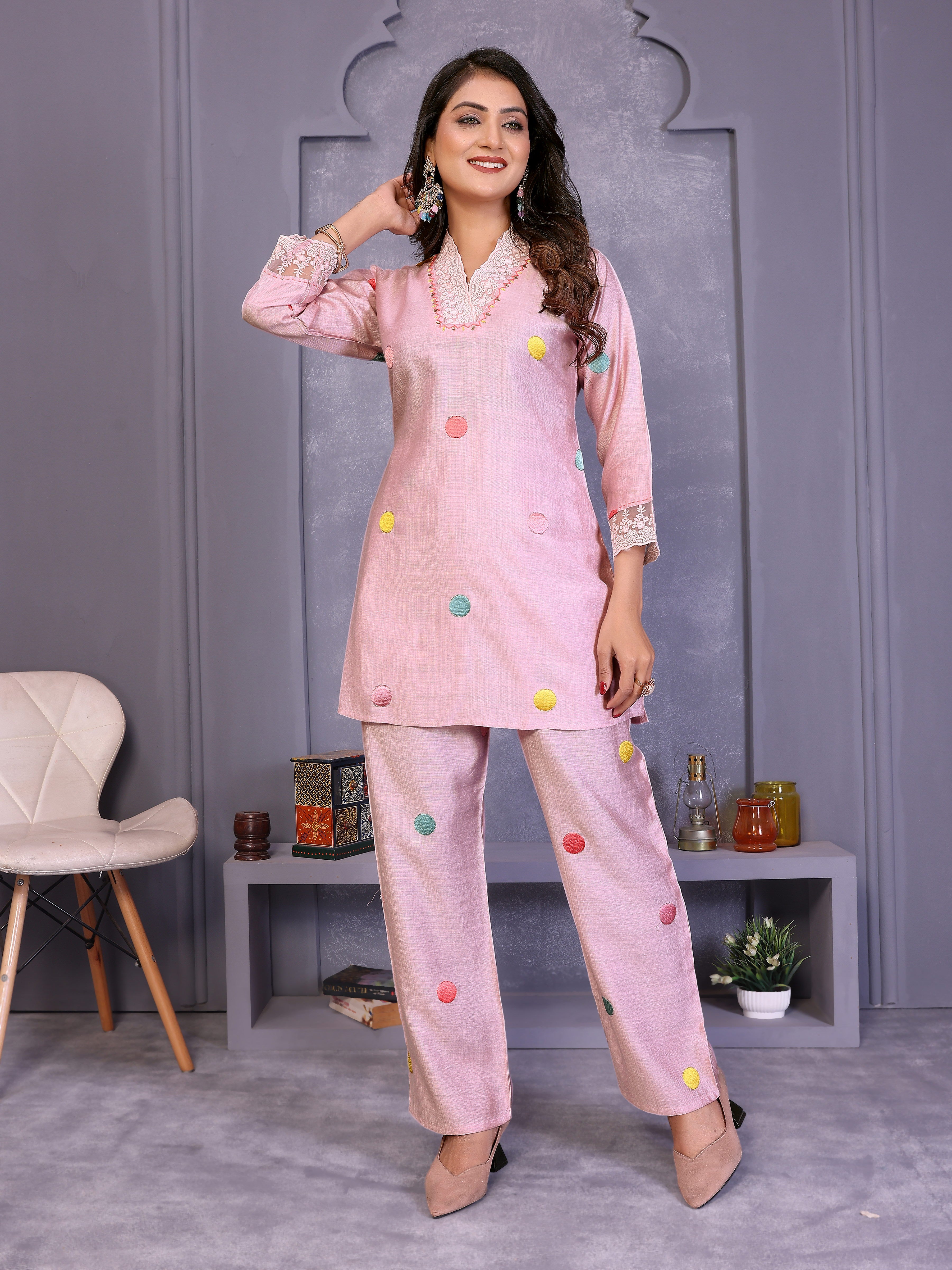 Details: Light Pink Embroidered Vatican Silk Co-Ord Sets
