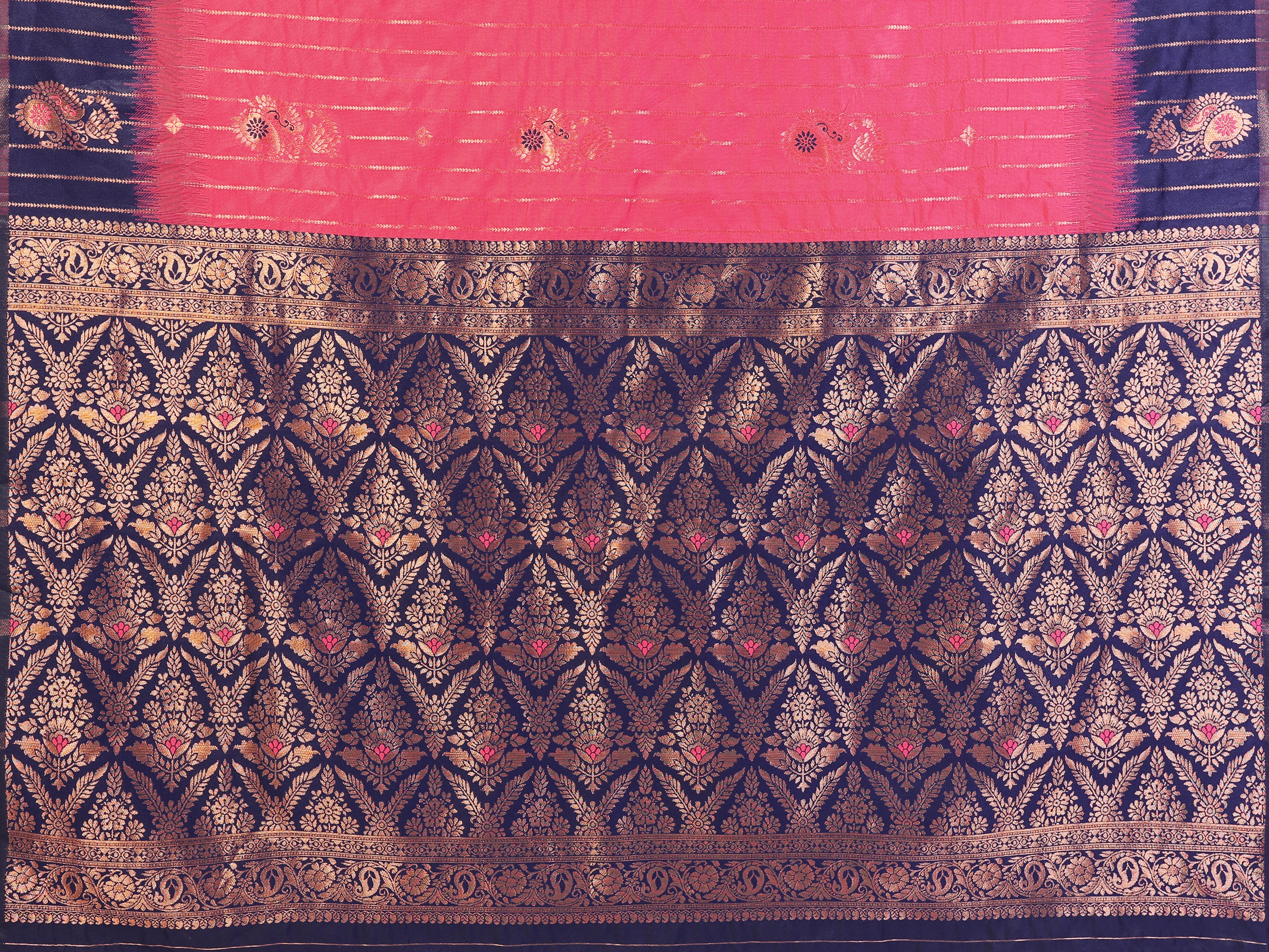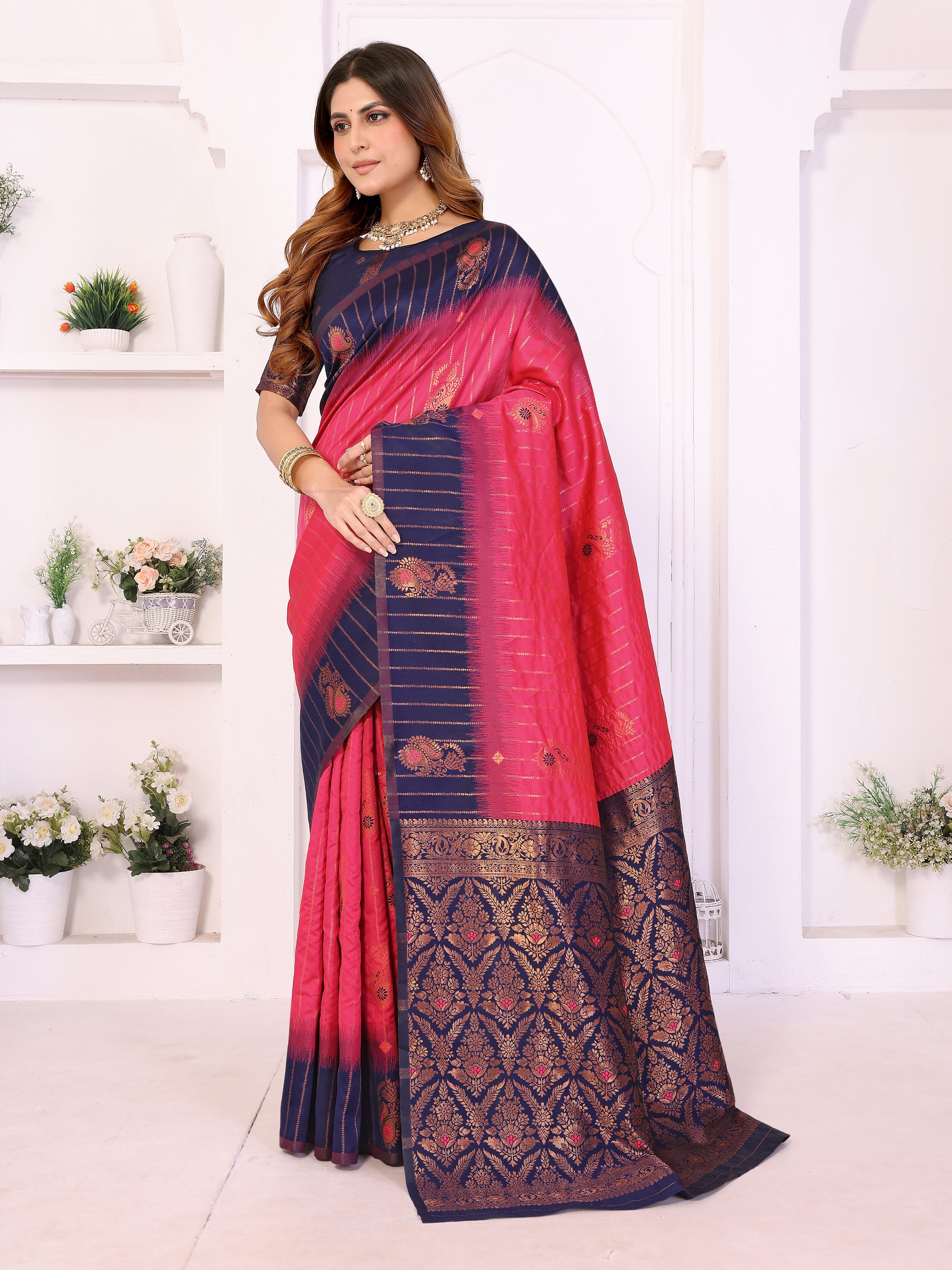 Details: Elevate your festive and wedding wardrobe with this exquisite Banarasi Silk Weaving Saree, beautifully designed in a vibrant pink body paired with an elegant navy blue border and pallu. The saree features intricate golden zari motifs and fine weaving patterns that highlight traditional craftsmanship. Paired with a matching navy blue blouse embellished with woven zari sleeves, this ensemble delivers a royal and timeless appeal. Perfect for weddings, celebrations, parties, and cultural events, this saree adds grace, charm, and sophistication to your ethnic style.