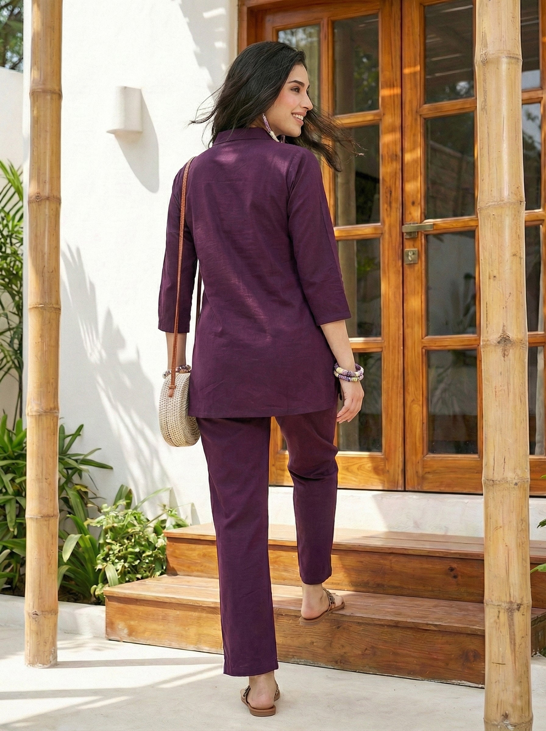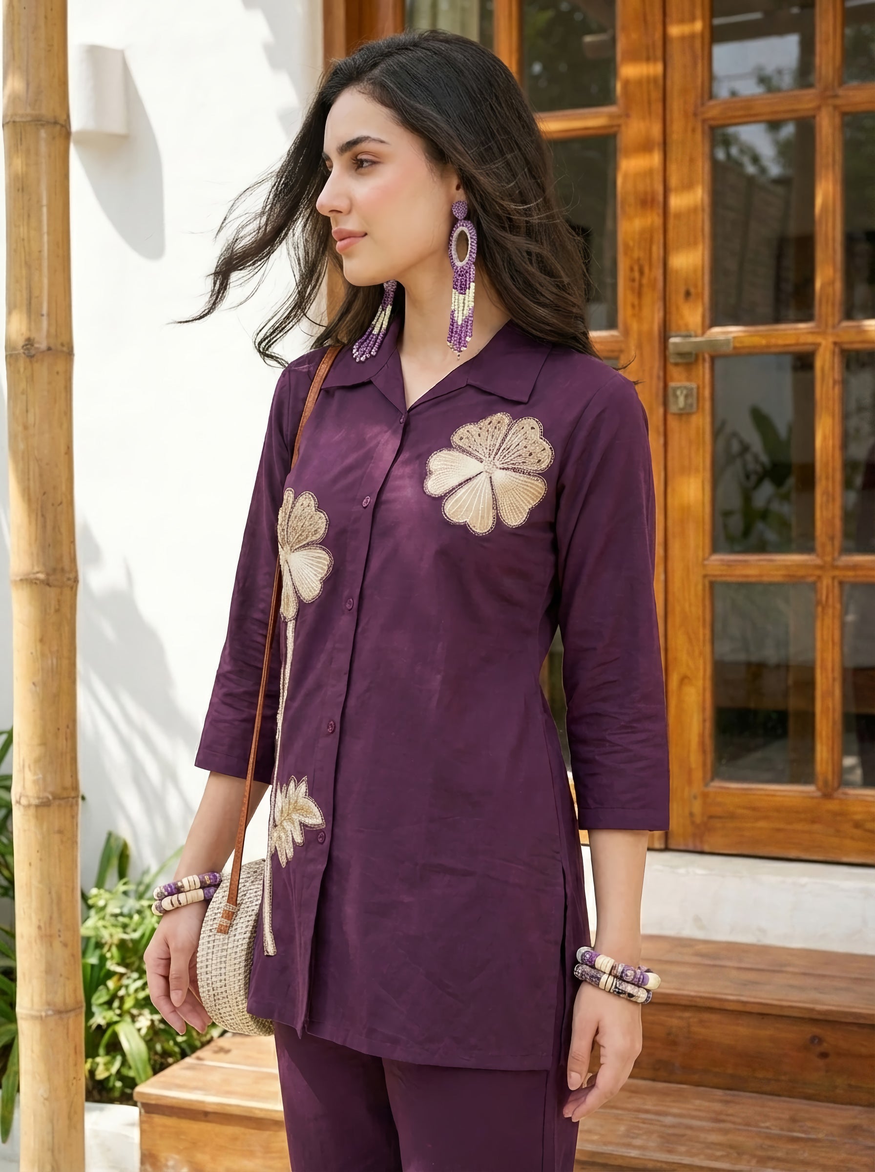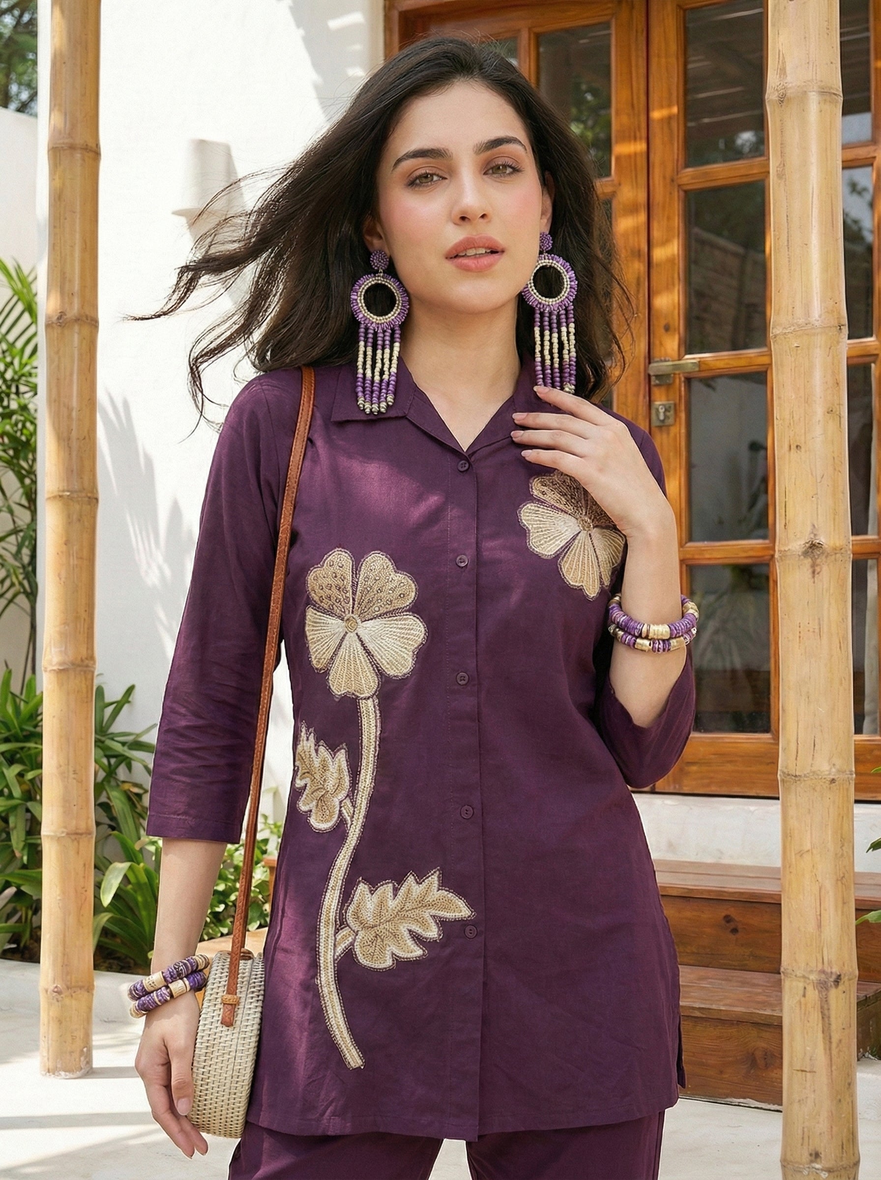 Details: Plum Purple Embroidered Cotton Co-Ord Sets