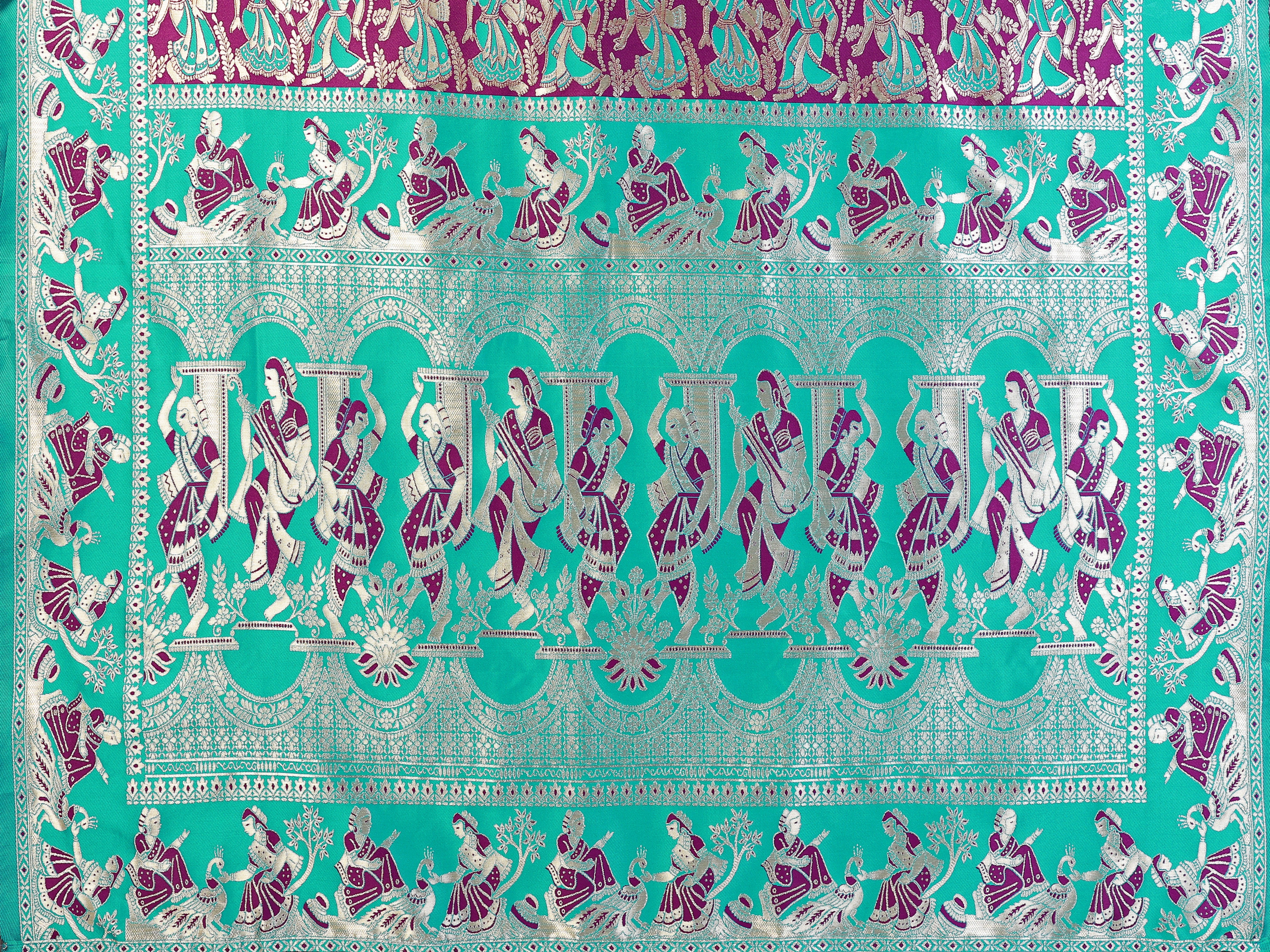 Details: This elegant plum and teal saree features intricate traditional motifs with a beautifully detailed pallu. Made from soft, smooth fabric, it drapes gracefully and adds a regal touch to any festive or wedding occasion. Comes with a matching blouse piece for a complete ethnic look.