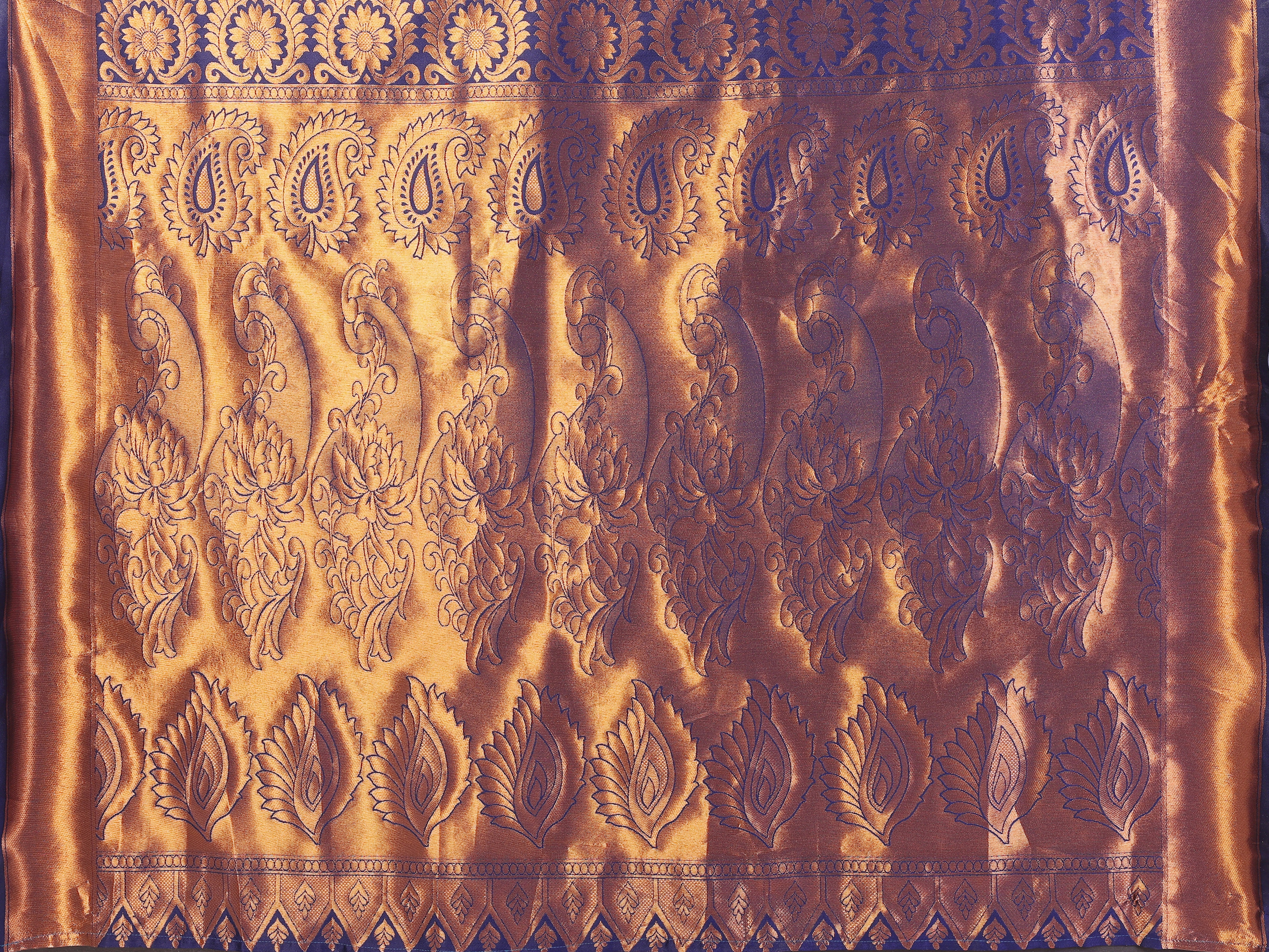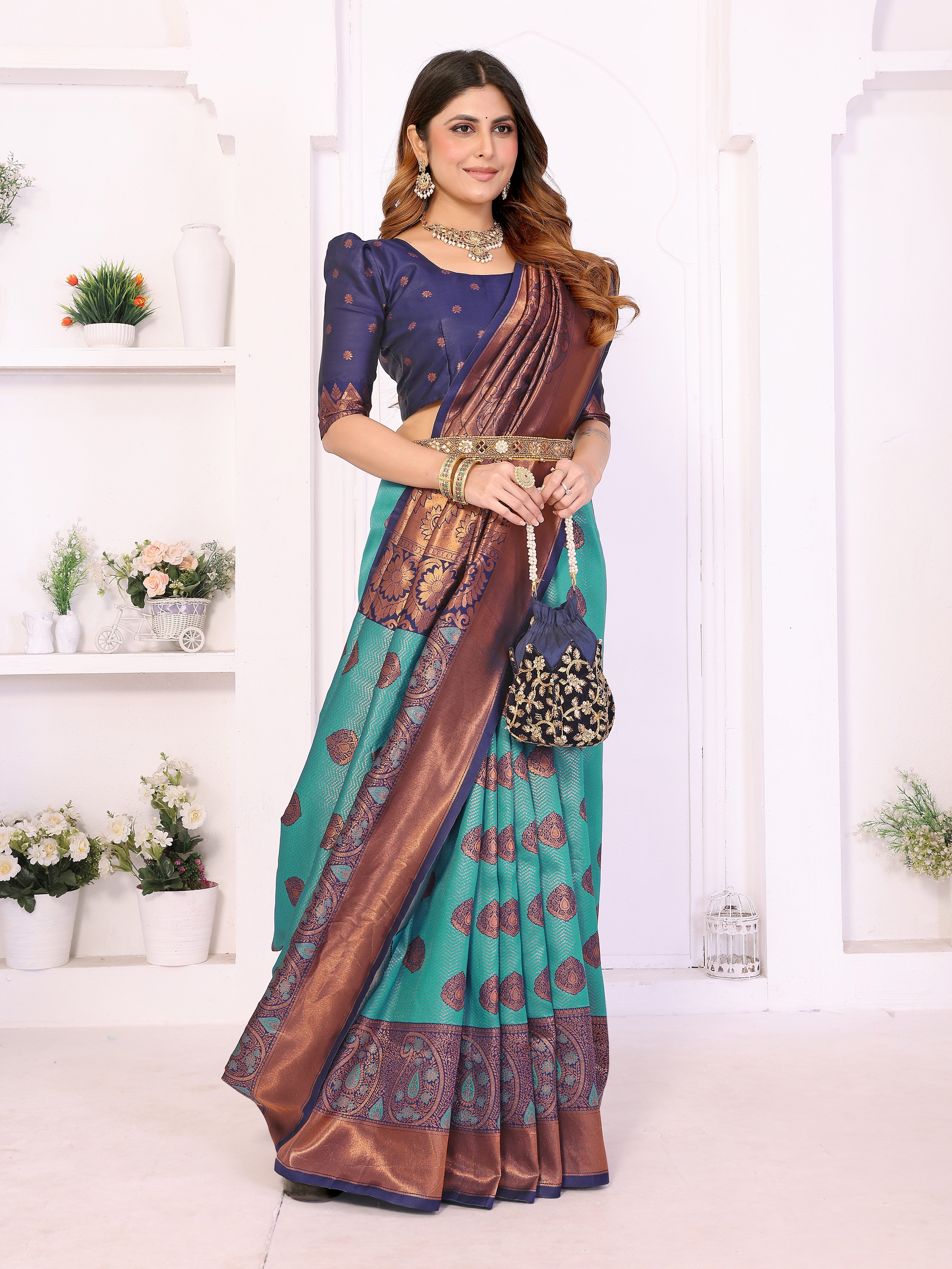 Details: This elegant teal and copper saree features rich woven motifs with a beautifully detailed pallu and contrasting navy blouse. Soft, smooth, and luxurious—perfect for weddings, festivals, and grand celebrations. Includes matching blouse piece.